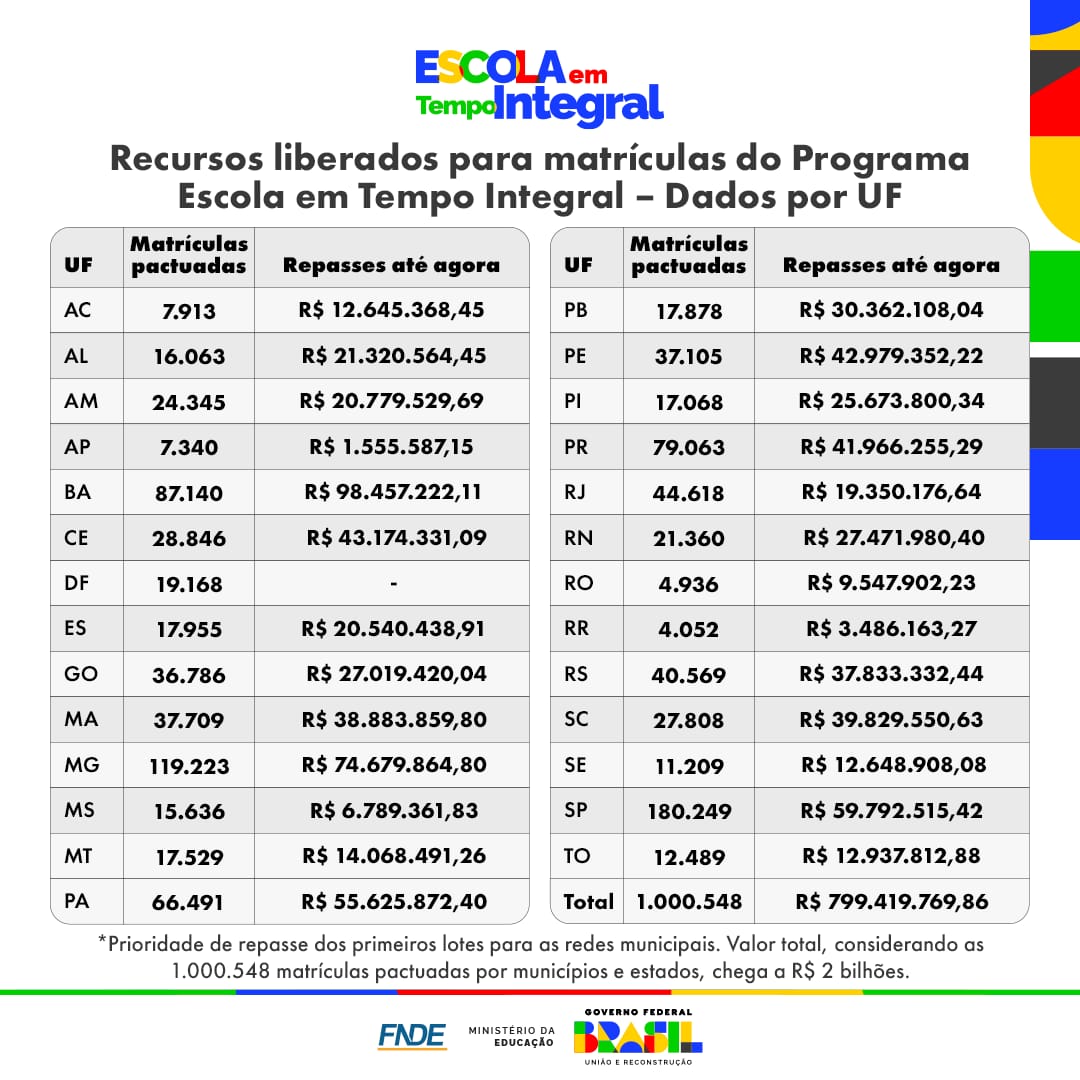 OMinistério da Educação (MEC) iniciou a liberação de mais de R$ 479 milhões para o pagamento do terceiro lote de recursos do programa Escola em Tempo Integral, que fomenta a criação de matrículas em tempo integral em todas as etapas e modalidades da educação básica. Ao todo, 4.148 secretarias de educação — entre os estados, o DF e os municípios — receberão a verba nos próximos dias. O pagamento começou nesta quarta-feira, 22 de novembro.